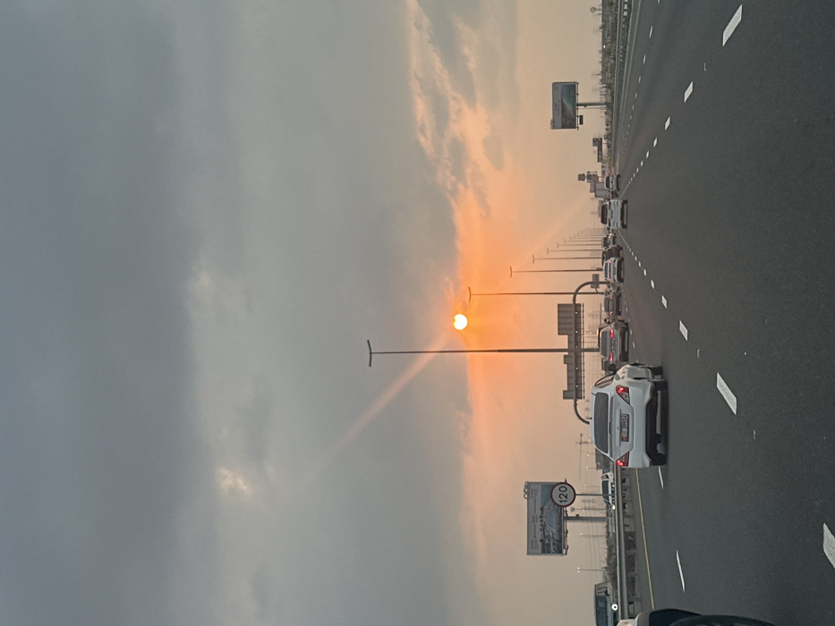 A traffic jam occurs on a multi-lane highway under a cloudy sky with a setting sun. The sun is partially obscured by clouds, casting an orange glow. Cars are lined up in multiple lanes. A sign indicating a speed limit of 120 is visible. Street lights line the highway's median strip. Billboards are visible in the distance.