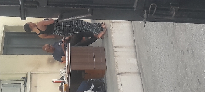 Two individuals stand next to a desk. A dark-skinned woman in a tank top and plaid bottoms is above the desk. A dark-skinned man in a blue shirt sits at the desk. The location appears to be an indoor office setting with a door frame and gray walls. The camera is capturing the scene at an angle.