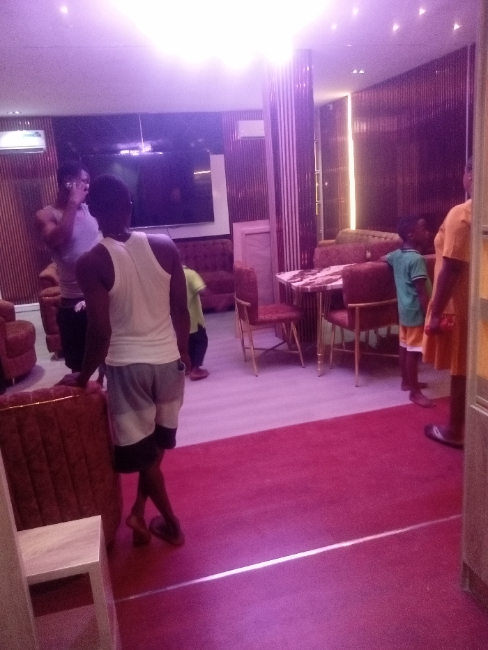 The scene depicts an interior space, likely a lounge or dining area, in Ukpor, Nigeria, illuminated with prominent purple/magenta ambient lighting and bright white overhead lights