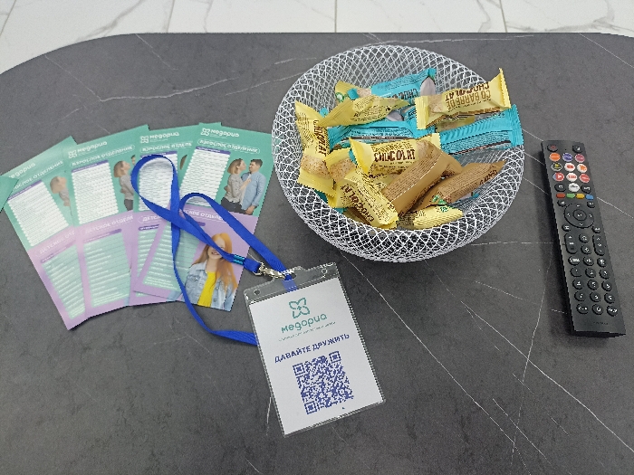 A collection of items is displayed on a dark grey, subtly veined tabletop in a facility located in Serpukhov, Russia. In the upper left background, a portion of a lighter, marbled surface is visible. On the left side of the table, approximately six light green and purple pamphlets are arranged in a fanned pattern. These pamphlets feature Russian text, including "МЕДОРИЯ" (MEDORIA), "ВЗРОСЛОЕ ОТДЕЛЕНИЕ" (ADULT DEPARTMENT), and "ДЕТСКОЕ ОТДЕЛЕНИЕ" (CHILDREN'S DEPARTMENT), alongside illustrations of adults and a child. A blue lanyard with an attached clear plastic badge holder rests on top of these pamphlets. The badge displays the "МЕДОРИЯ" logo, the Russian phrase "ДАВАЙТЕ ДРУЖИТЬ" (LET'S BE FRIENDS), and a QR code. To the right of the pamphlets, a silver-colored, mesh wire basket is filled with numerous individually wrapped candies. Many wrappers are yellow or light blue, with "CHOCOLAT" or "CÔ BARRE DE CHOCOLAT" visible on some of the yellow wrappers. To the far right, a black remote control is placed, featuring a directional pad, numeric keys, and several colored application buttons, including those for common streaming services.