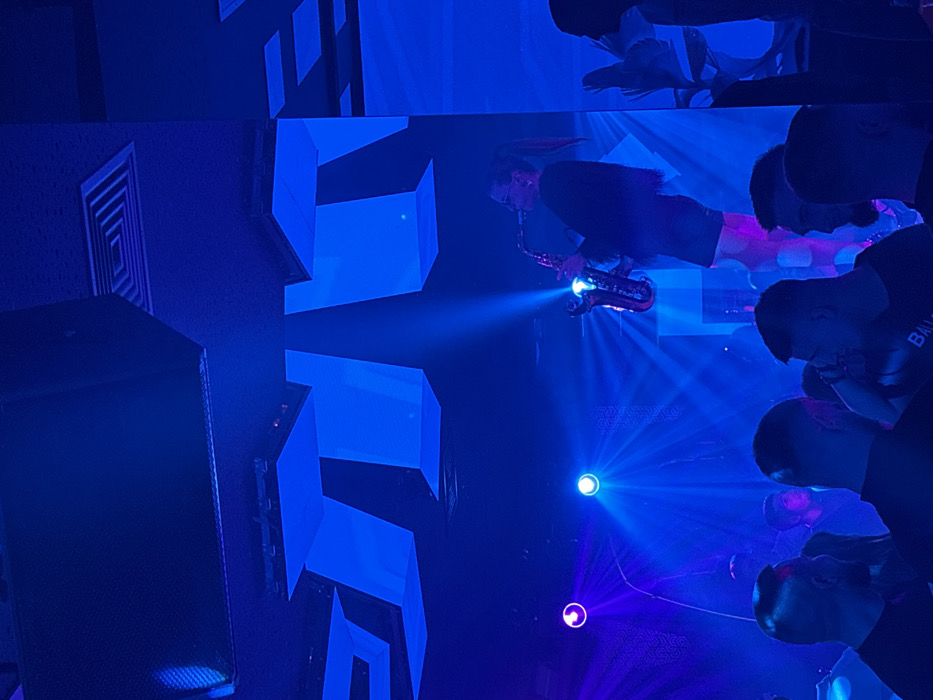 The scene depicts the interior of PM Club Sofia, located at Boulevard Vitosha 2B, 1000 Sofia Center, Sofia, Bulgaria. The environment is a dimly lit nightclub, illuminated primarily by blue and purple stage lighting, suggesting an evening performance. A female saxophone player is positioned on an elevated platform or stage segment, slightly right of the frame's center. She is captured in profile, facing left, actively playing a gold-colored alto or tenor saxophone. Her dark hair is styled in a high ponytail, and she wears a dark, long-sleeved top with a fringed or textured hem, paired with dark shorts or a short skirt. A focused, bright white light beam illuminates her and the instrument from above. The ceiling is dark, featuring multiple angular, geometric panels, some of which are internally illuminated with bright blue light. Large, dark speaker enclosures are mounted on the ceiling. Various spotlights project intense blue and purple beams downwards, cutting through visible atmospheric haze. A distinct purple circular light source is visible on the left, with a white/blue circular light source to its right. The lower third of the image shows a crowd of individuals, predominantly male, partially silhouetted and seen from the torso up. They are positioned below and in front of the performer, appearing to observe the performance and engage in social interaction. One individual in the foreground wears a dark shirt with partial lettering "BALEN" visible, likely referring to "Balenciaga." The overall atmosphere is characterized by energetic stage lighting and a live music performance.