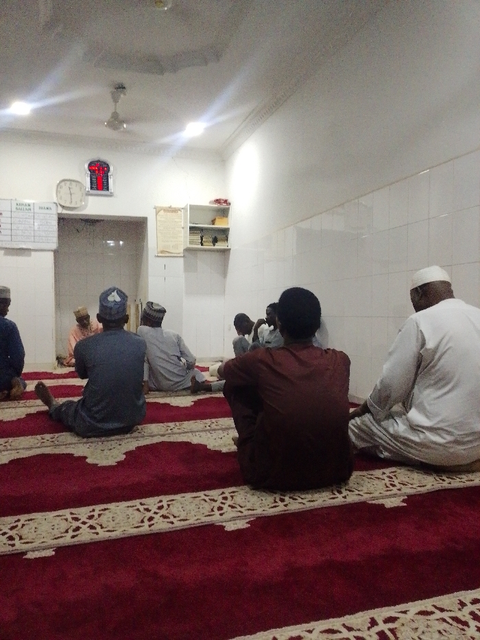 - "Several Muslim men are seated on a red patterned carpet inside a mosque" by FM-WfIwR2, licensed under CC BY 4.0
