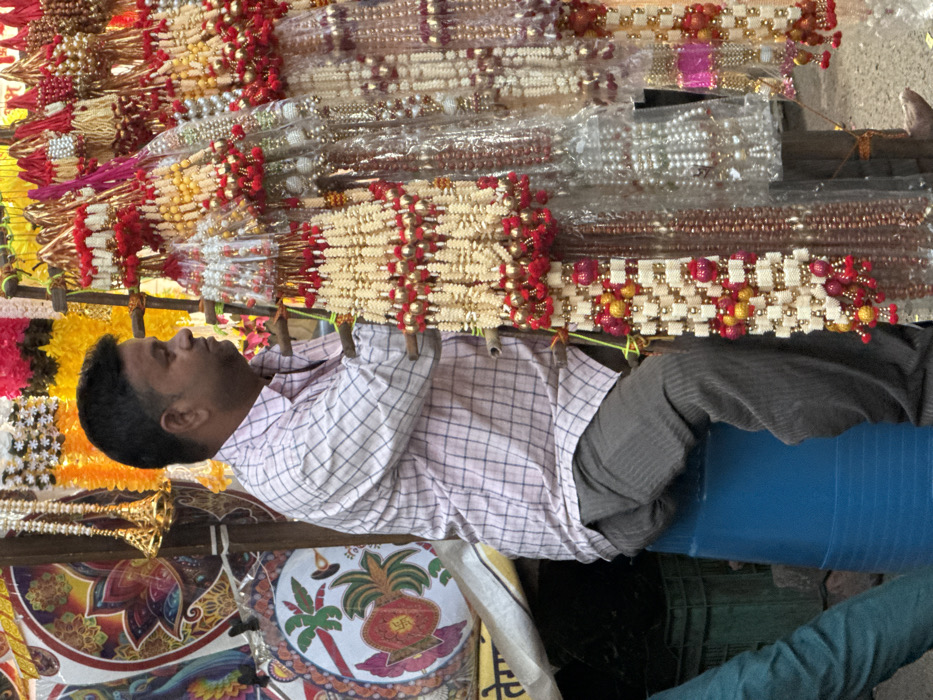 A mid-adult man, viewed in profile, sits on a blue plastic drum or stool, looking towards the right. He wears a light pink and white checkered long-sleeved shirt and dark grey striped trousers. To his immediate right, numerous artificial garlands are displayed, hanging vertically from a rustic wooden or bamboo frame. These garlands are primarily off-white or cream-colored, interspersed with red and gold spherical ornaments, and some include pink, yellow, and red accents. Several garlands are partially wrapped in clear plastic. In the background on the left, ornate circular decorations are visible; one depicts a palm tree, a kalash (pot), and a Swastika symbol. Golden bells hang from strings above. Indistinct text on a yellow and white banner is partially visible in the upper left. A leg in teal pants is visible in the bottom left corner. This scene depicts a street vendor stall selling festive or religious decorations in a market area of Howrah, India.