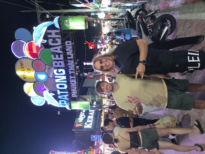 Two men stand in front of a brightly lit "Patong Beach, Phuket Thailand" sign at night