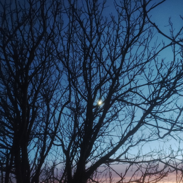 The image depicts an outdoor scene at twilight or night, located in Лунненскі сельскі Савет, Belarus. The foreground is dominated by the dark silhouettes of multiple deciduous trees, their bare branches forming an intricate network against the sky. The sky exhibits a gradient, transitioning from a deep indigo-blue at the top to a lighter, more cyan-blue in the mid-ground, and a faint orange-pink hue at the lowest visible horizon. A small, bright, circular luminary, consistent with a moon, is visible through a gap in the tree branches, positioned slightly right of the vertical center and in the upper half of the frame. No individuals, discernible actions, or interactions are present. The environment appears natural and unpopulated.