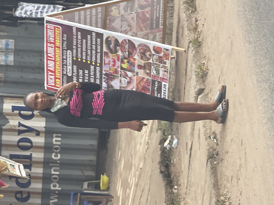 The scene depicts an outdoor setting in Nkpor, Nigeria. A dark-skinned female, appearing to be in her twenties or thirties, stands centrally on an unpaved shoulder next to a road. She wears a long-sleeved black dress featuring two horizontal pink geometric patterns, one across the upper chest and another at the waist. Her hair is styled short and dark. She wears grey slide sandals. Her right hand is raised towards her neck, where a light-colored, patterned scarf or accessory is visible. Her expression is neutral, and she looks directly forward. To her right (viewer's left), a white A-frame sign stands prominently. The sign is titled "VICKY AND LADIES WORLD AND ENTERTAINMENT INDUSTRY" and lists various services such as "EVENT PLANNING," "FIXING OF NAILS & LASHES," "CARVING OF EYE BROW," "MICRO BREEDING," "EYE LASH EXTENSIONS," "PEDICURE AND MANICURE," "ODA CANOPIES," and "GENERAL MAKE OVER." The lower portion of the sign displays multiple small, colorful images related to these services. Behind the woman and the sign, a large, ribbed metal structure, likely a shipping container or a building of similar construction, is visible. It is light brown with dark vertical stripes, and features large blue text reading "ed Lloyd" and "w.ponl.com." To the far left, partially visible against the container, are small chairs or stools and a yellow plastic basin on the ground. The ground immediately around the woman is uneven dirt or gravel with sparse vegetation and some scattered debris.