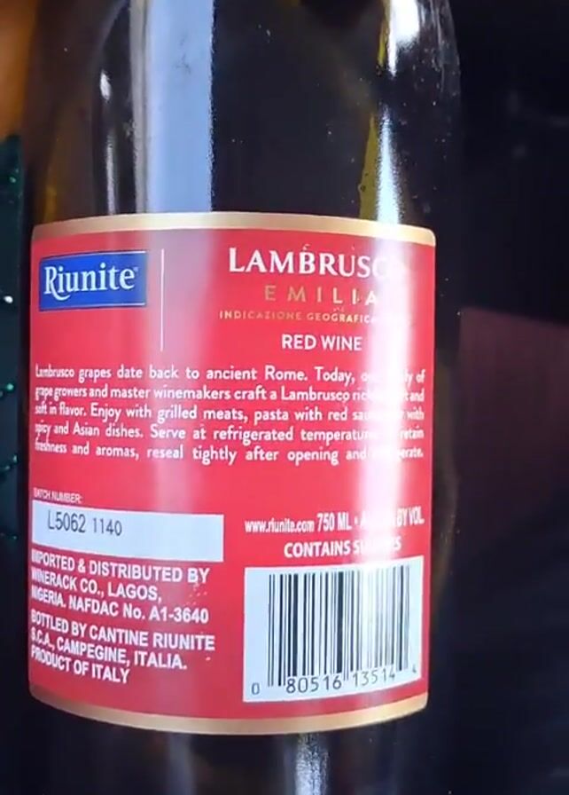 person holding a bottle of Riunite Lambrusco Emilia red wine. The bottle has a red label with white text, and a sticker that reads "10,000". The back of the bottle displays the ingredients and distribution information. The bottle is held against a backdrop of what appears to be dark clothing. The person rotates the bottle slightly.