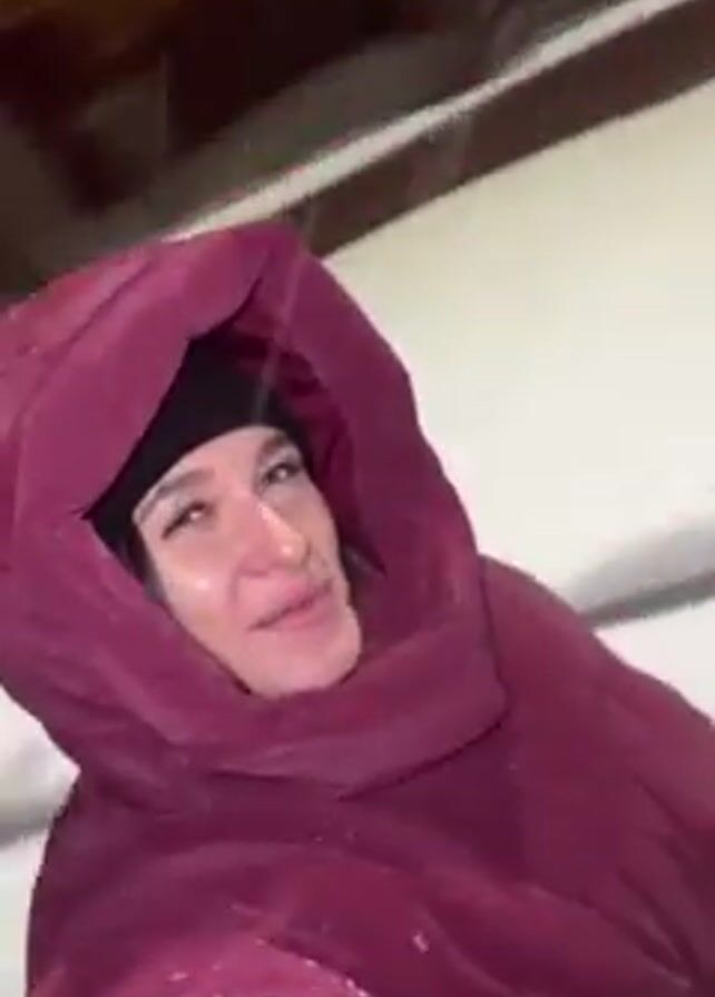 A woman wearing a dark beanie and a large, hooded, maroon puffer jacket is recording a video of herself in the snow at night. Her face is visible, and she is smiling and laughing. She moves the camera while speaking, though the audio is not available. Snowflakes are visible in the air, illuminated by what appears to be a streetlight.