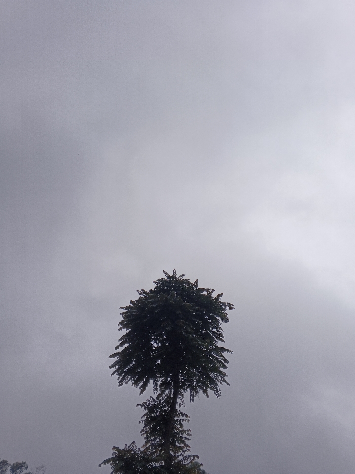 The image displays a prominent, tall tree centered against an overcast, grey sky in Pinnwe, Myanmar (Burma). The tree exhibits a dense, dark green canopy formed by numerous compound, fern-like leaves. A smaller, distinct set of foliage is visible lower on the trunk, suggesting either a multi-trunk growth or a secondary tier. The sky occupies the upper two-thirds of the frame, uniformly grey with subtle variations, consistent with heavy cloud cover or fog. The extreme lower-left corner shows hints of additional tree canopy. No individuals, animals, or man-made structures are discernible within the frame. The scene is illuminated by diffuse, natural light.