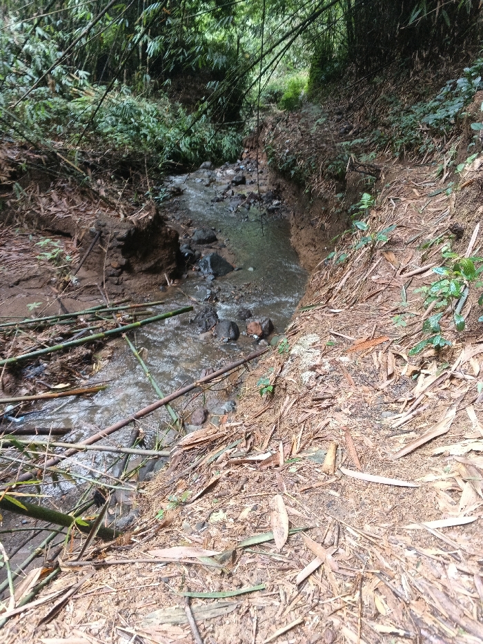 This image, taken in Baglung, Nepal, depicts a narrow, rocky stream flowing through a heavily vegetated, eroded natural environment