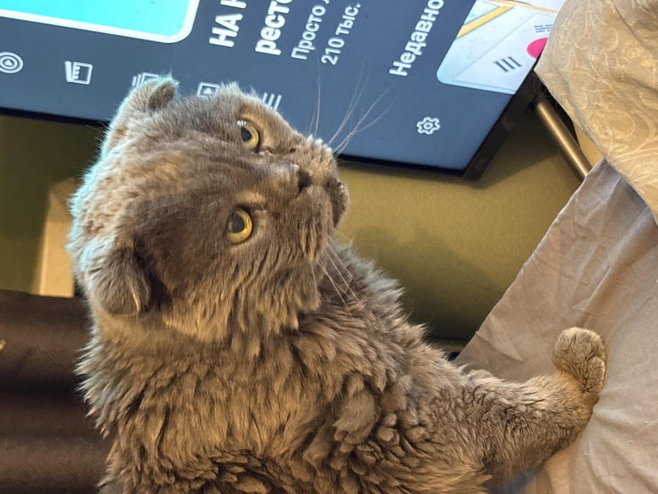 - "A fluffy, gray Scottish Fold cat with golden eyes looks upward, seemingly captivated by a television screen showing Russian text" by FM-08PzB2, licensed under CC BY 4.0
