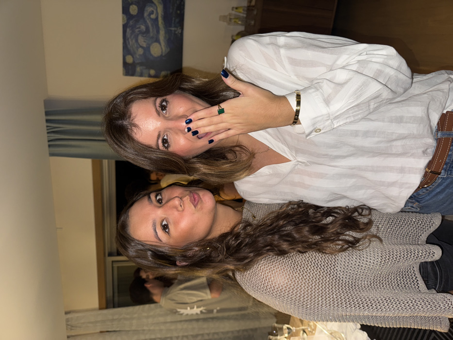 This image captures two young adult women posing in the foreground of an indoor social gathering, situated within a residence in Vila Nova de Gaia, Portugal. The woman on the left has long, wavy brown hair and is wearing a light brown, open-knit sweater over a darker garment. She faces the camera with pursed lips. The woman on the right, with shoulder-length brown hair, wears a white, vertical-striped long-sleeved shirt, blue jeans, and a brown belt. Her left hand, featuring dark blue nail polish, a gold-colored bracelet, and a distinct rectangular emerald-green ring on her ring finger, is partially covering her mouth, conveying an expression of surprise or delight as she looks directly at the camera. In the blurred background, several other individuals are present, indicating a social event. A male figure wearing a light-colored t-shirt with a graphic is partially visible on the far left. A portion of a table with multiple clear glass stemware is visible in the lower-left foreground. The light-colored wall in the right background displays a framed print resembling Vincent van Gogh's "The Starry Night" artwork, positioned above a dark wooden cabinet. Light blue/grey curtains are drawn over a window or sliding door in the upper-left background. The scene is illuminated by interior lighting, suggesting an evening setting.
