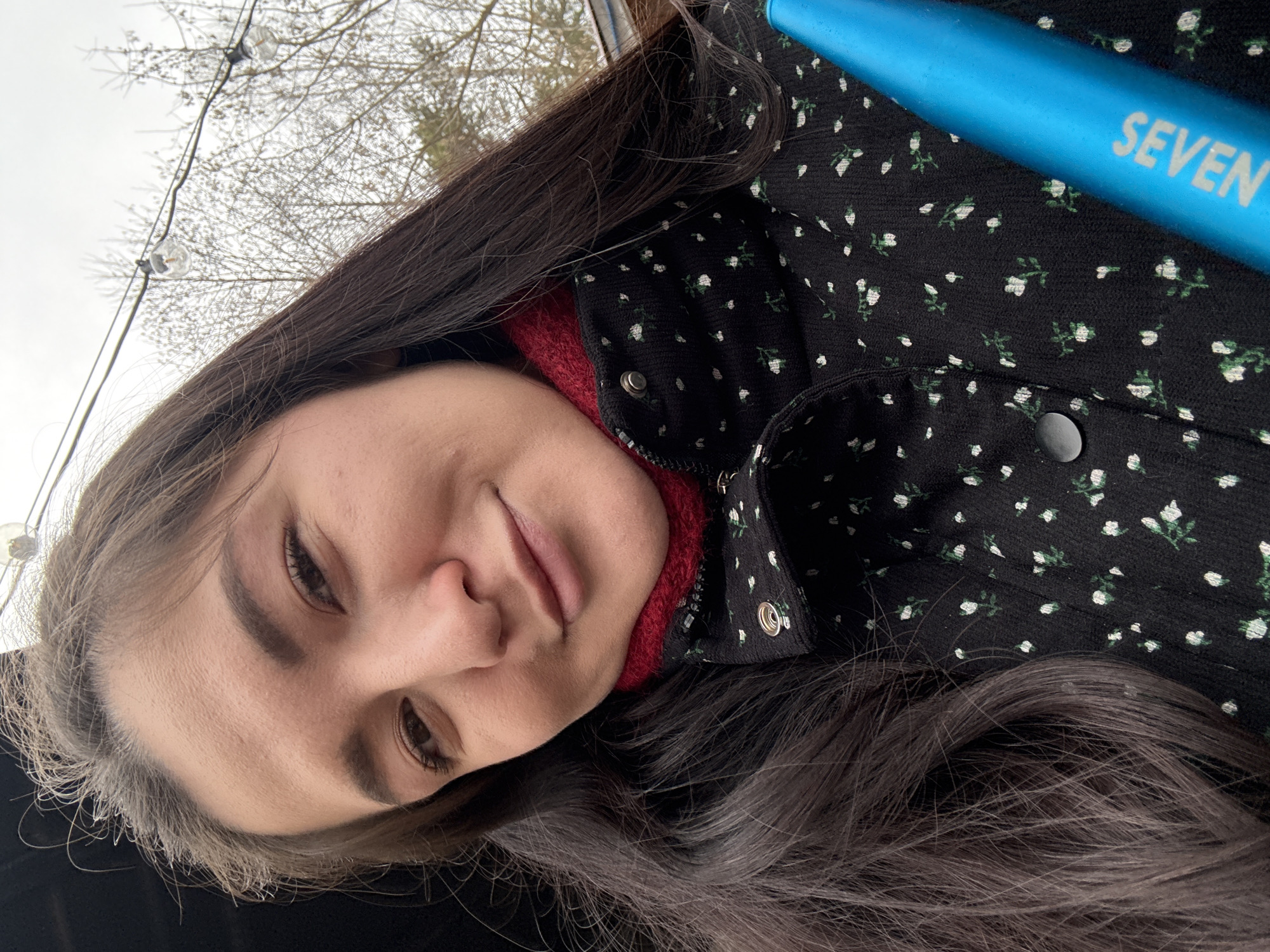 The scene is an outdoor setting in the city of Kurovskoye, Russia. A female subject is captured in a close-up selfie, facing the camera with a slight smile. She has long, dark brown hair and is dressed in a black jacket featuring a white and green floral pattern, worn over a red, textured collar. A bright blue cylindrical object, bearing the white text 'SEVEN,' is partially visible on the lower right side of the frame. The background consists of an overcast sky, leafless trees, and a string of clear globe lights, suggesting a temperate, possibly late-season, environment.