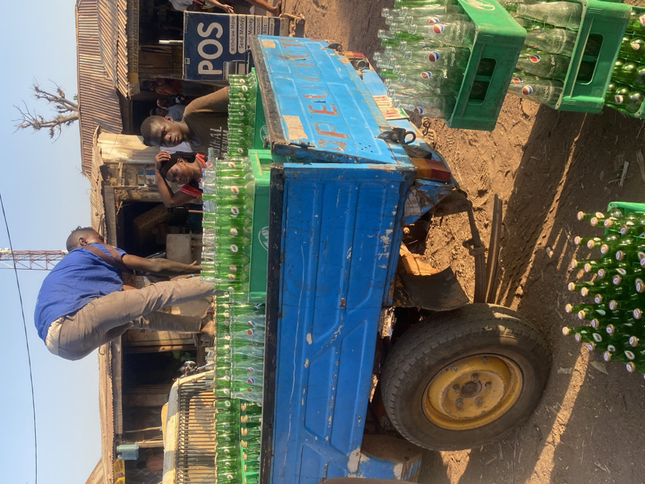 The image depicts an outdoor commercial scene in Rido, Nigeria, centered around a blue three-wheeled utility vehicle. The vehicle's bed is heavily loaded with multiple green plastic crates filled with clear glass bottles, predominantly identified as Pepsi-branded, some appearing empty. Additional crates of identical bottles are stacked on the dry, reddish-brown earthen ground beside the vehicle. A male individual, dressed in a blue shirt and grey trousers, is standing on the vehicle's bed, bent over as if arranging or unloading items. To the right of the loaded crates, a woman in a red top with dark hair is visible, looking forward. Beside her stands a young boy in a brown t-shirt, also looking towards the camera. In the background, a row of single-story buildings with corrugated metal roofs suggests a market or commercial street. A partially visible sign reads "SALES OF PHONE ACCESSORIES & REPAIR," and another prominent white and blue sign advertises "POS" services including "Withdraw Money," "Send Money," "Account," "Bills," and "Airtime." A tall metal structure, possibly a communication tower, and a leafless tree are also visible in the distant background. The scene is illuminated by natural sunlight, casting distinct shadows, indicating either morning or late afternoon. The utility vehicle itself shows signs of wear, including rust and chipped paint, and has "PEUGEOT" partially visible on its side, along with a partially obscured license plate reading "OG 441 KJJ".