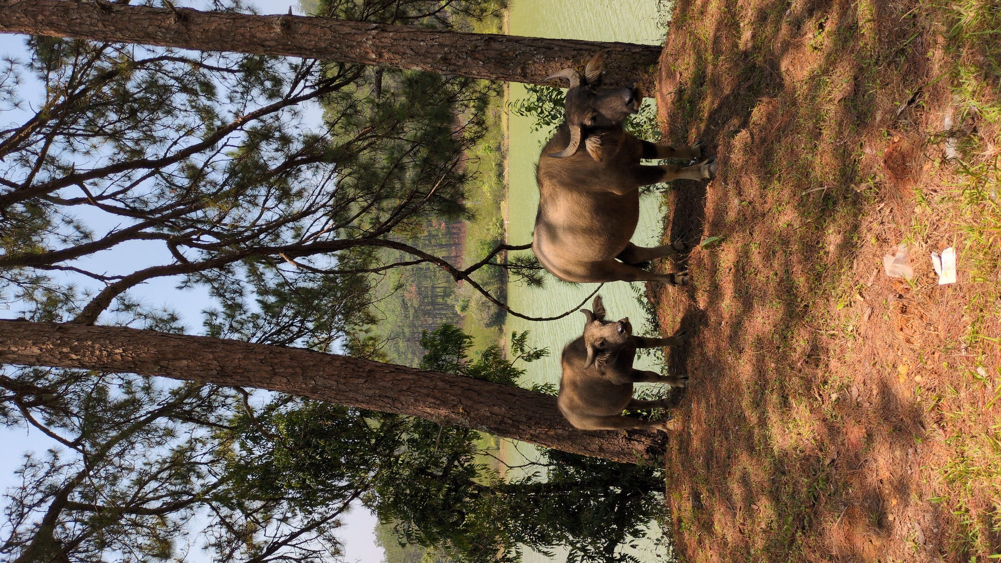 two water buffalo standing on a grassy slope next to a lake. The water buffalo are different sizes. One is significantly larger than the other. The larger water buffalo is standing closer to the camera. The lake is green-tinged. Two pine trees frame the left side of the picture. In the background, a forest can be seen on the opposite side of the lake. The image appears to be taken in daylight. There is trash in the lower right of the image. This image was taken in Lang Biang - Da Lat, Vietnam.