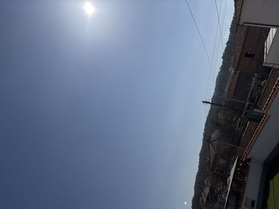 The image presents an outdoor scene depicting a residential area in Karavelovo, Bulgaria, under a clear, bright blue sky. The sun is prominently visible in the upper right quadrant, emitting a strong lens flare, indicating daytime. The horizon is defined by a dense line of evergreen trees covering a distant hillside. In the midground, a collection of single-story houses with terracotta-tiled roofs and walls constructed of brick and stone are visible, interspersed with bare deciduous trees and shrubs. Utility poles with multiple overhead wires traverse horizontally across the scene. In the foreground, a low, white-painted wall capped with orange-brown roof tiles stretches from the lower left. A small patch of green grass is visible to the left of this wall, and a partially visible covered outdoor structure with a slatted roof is situated in the lower-left center. A portion of a white building is also visible in the lower right. No individuals or specific actions are depicted.
