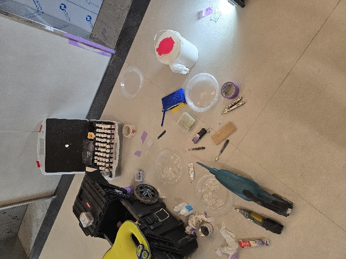 - "Scattered on the floor are various objects, including a toolbox with a section open, a white bucket with a red substance inside, plastic containers, brushes, and a teal-colored handheld device" by FM-VT8K93, licensed under CC BY 4.0