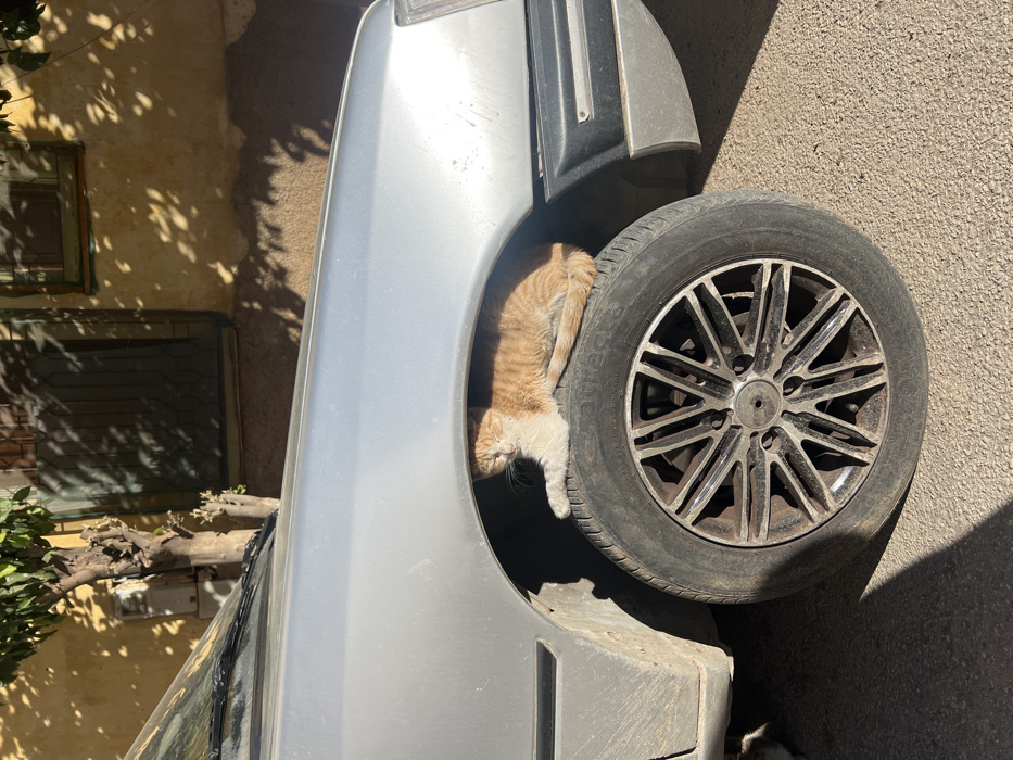 - "A light orange and white tabby cat is observed resting on the front passenger-side tire of a silver sedan, positioned within the wheel well" by FM-mFT753, licensed under CC BY 4.0