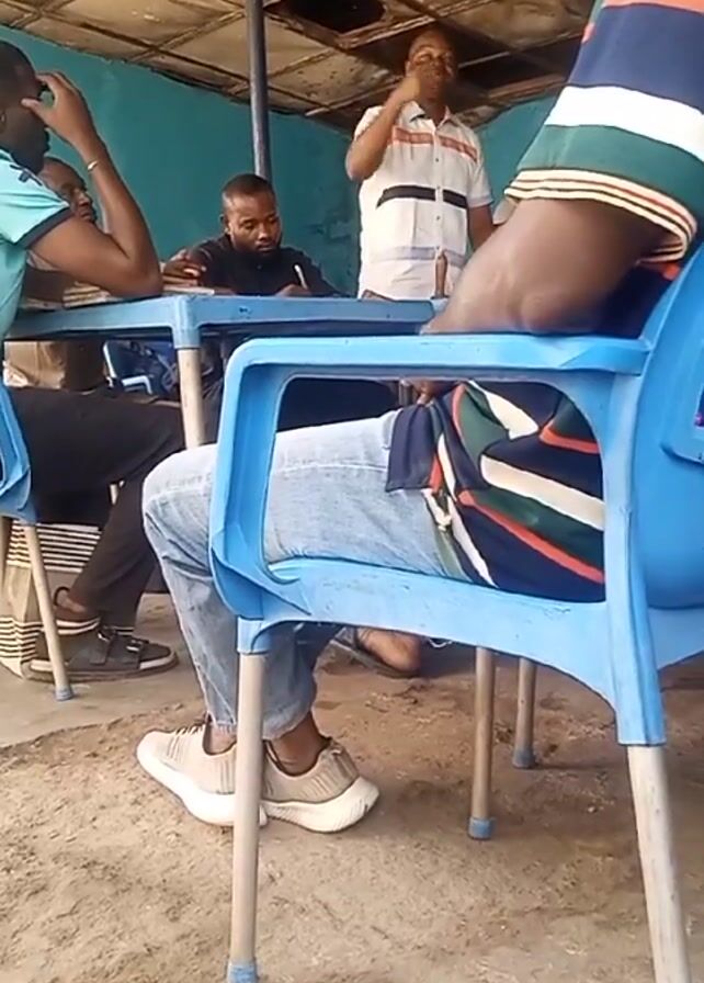 four men gathered around a blue plastic table under a makeshift roof. Three men are seated, and one is standing. The man standing is gesturing with his hands as he speaks, appearing to be addressing the others. One seated man is taking notes. The table is outdoors on a sandy ground. The overall setting appears to be casual.