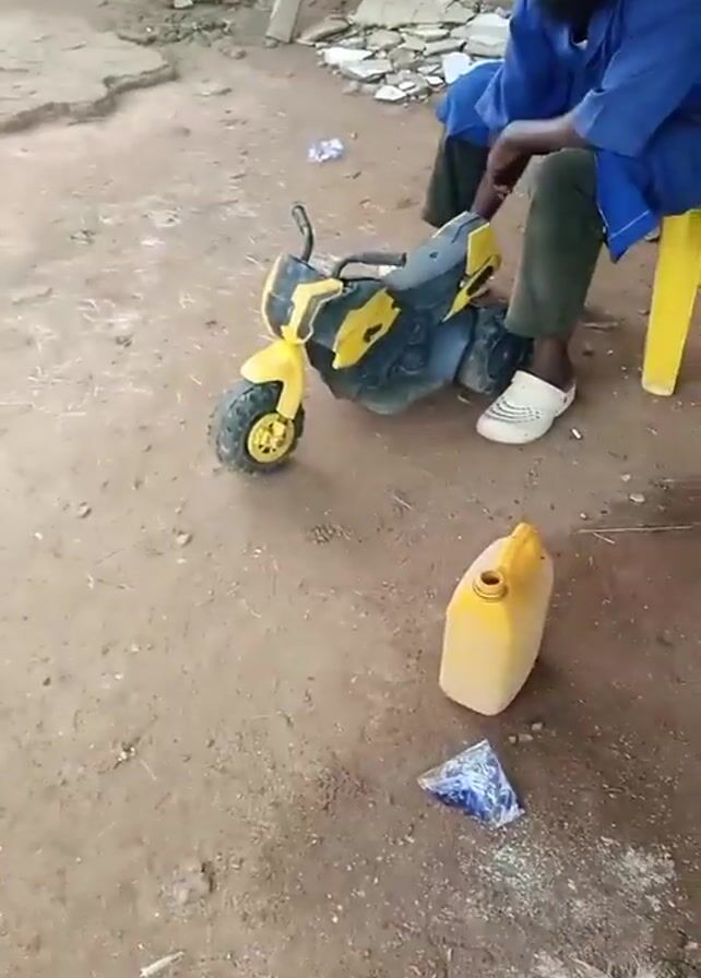 A man is sitting on a yellow plastic chair, next to a yellow and black toy motorcycle. He is wearing a blue shirt, green pants, and white slip-on shoes. A yellow plastic jug and a small blue package are on the ground nearby. The ground is a dirt surface, and there is debris scattered around, including pieces of broken tile or plaster. In the background, there's a building with green trim and a corrugated metal roof.