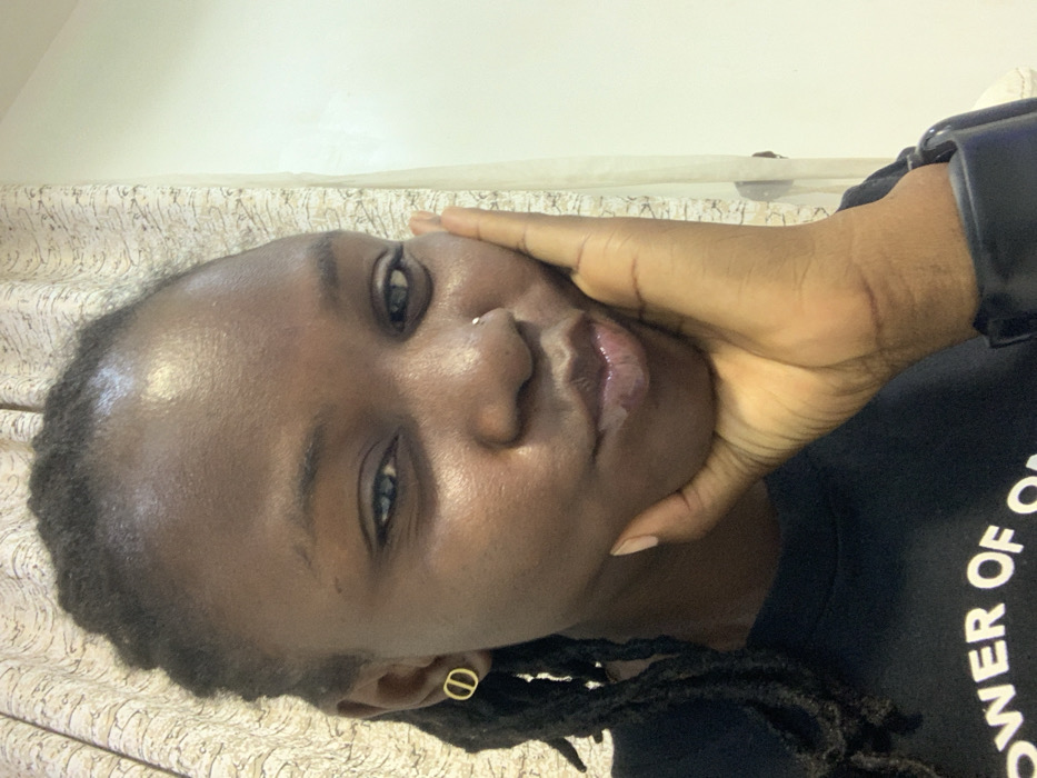 A selfie shows a dark-skinned woman with glossy lips and a nose ring