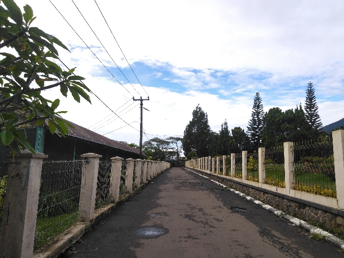 The image captures a straight, narrow asphalt road extending into the distance under a partly cloudy sky in Hafjell, Norway. The road surface exhibits wear, including potholes and multiple dark, irregular wet patches. On the left side, a light-colored concrete post and wire mesh fence runs parallel to the road, partially obscured in the foreground by dark green foliage. Behind this fence, a long, low building with a dark, corrugated metal roof is visible. Further down the left side, a utility pole supports multiple overhead wires against the sky. On the right side of the road, a decorative fence composed of light-colored concrete posts and black wrought iron sections sits atop a stone wall with a white painted curb at its base. Behind this fence, a landscaped area features green grass, shrubs, and various trees, including tall conifers. A distant mountain or hill is faintly discernible on the far right horizon, above the treeline. No individuals, vehicles, or animals are present in the scene.
