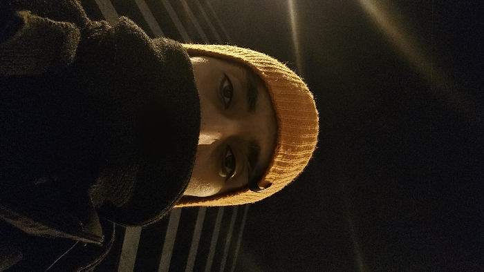 A person wearing a yellow beanie and a black jacket is shown from a close, low-angle view. Most of their face is visible, with eyes staring directly at the camera. The jacket obscures part of their face on the left side. The background is dark, with vertical light stripes. A light source illuminates the beanie, creating a contrast between the subject and the background. The photo has a slightly grainy texture.