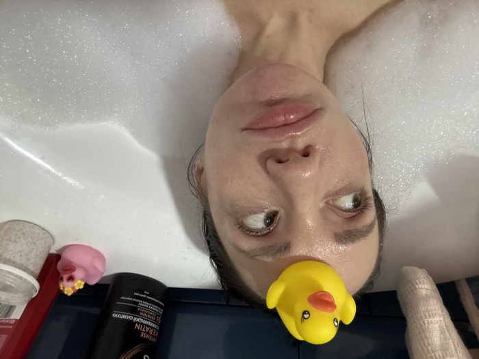 The image depicts an indoor scene within a bathroom, showing an individual immersed in a bathtub filled with white foam