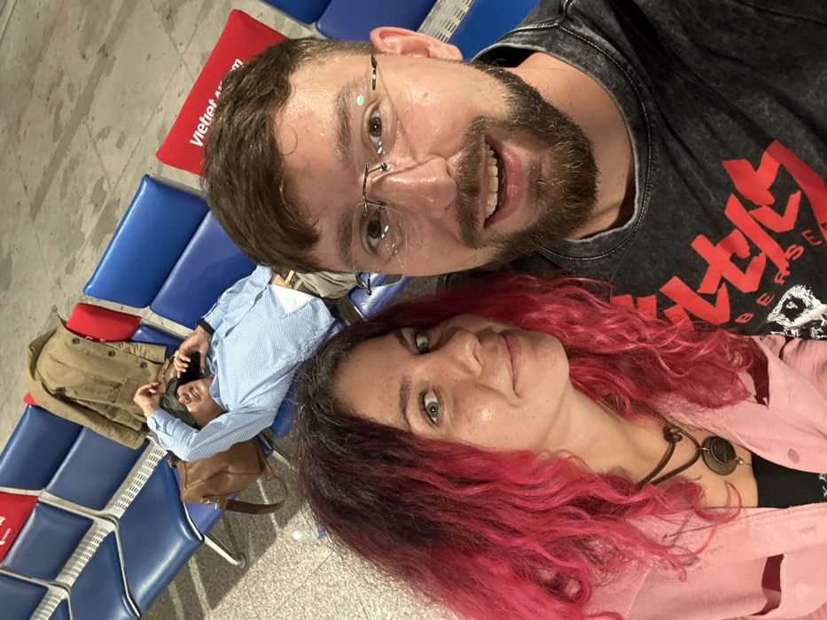 Two people, a man with glasses and a beard wearing a dark t-shirt, and a woman with pink hair and a pink shirt, are taking a selfie in an airport waiting area