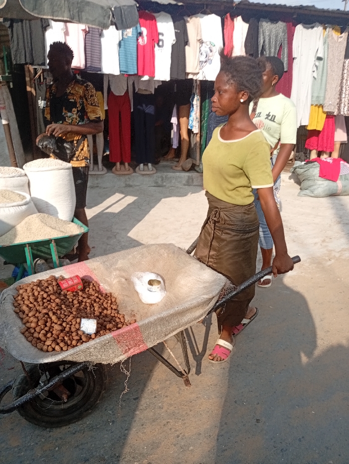 A woman is pulling a wheelbarrow full of peanuts in an outdoor market. She wears a green top, brown wrap skirt, and sandals. A white container sits on the wheelbarrow. Behind her, another woman in a light green shirt stands nearby. To the left, a man in a patterned shirt handles bags of rice. Clothing hangs on display in the background, under a makeshift corrugated metal roof.