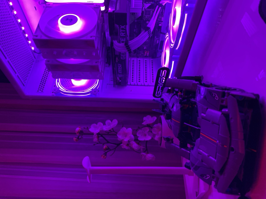 The scene depicts an indoor environment in the city of Silistra, Bulgaria, illuminated primarily by purple LED lighting. In the foreground, a dark-colored, detailed model sports car, possibly a buildable toy, rests on a light-colored surface. The car features orange accents, and its rear spoiler prominently displays the word "GRIGS" in white lettering. To the left of the car, a white stand with a curved top is present, positioned in front of a potted artificial plant with multiple white or light-pink flowers and dark stems. To the right of the car, a white desktop computer case is visible, revealing internal components. Within the case, multiple cooling fans glow with bright purple LED rings; three are positioned higher, and two are visible lower down, mounted on what appears to be the bottom panel. A graphics card bearing "MSI GEFORCE RTX" text and white braided cables are discernible within the PC tower. The background features a light-colored curtain with vertical stripes, bathed in the pervasive purple light. No individuals are present in the image.