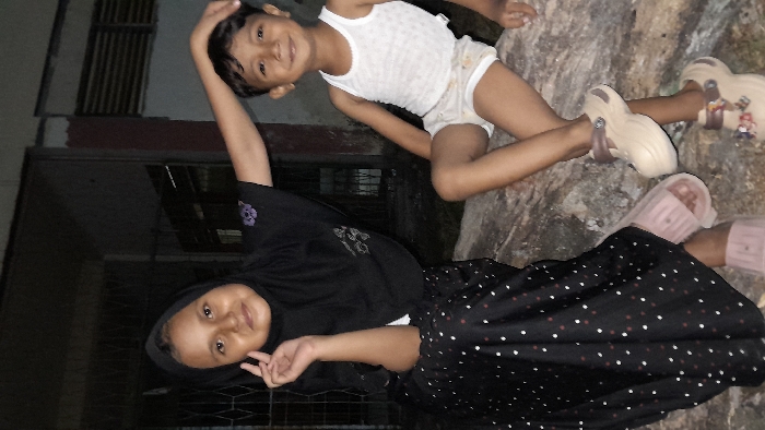 Two children pose for a photo outside. A young girl wearing a black dress with white polka dots and a hijab makes a peace sign. Next to her, a young boy in a white tank top and briefs smiles with his hand on his head. They are both lying on what appears to be a concrete or stone surface. The girl wears pink slides, while the boy has on beige Crocs. A building with grated windows is faintly visible in the background.