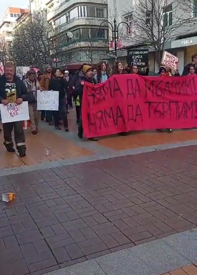 A group of people are protesting, walking along a brick-paved street. The group is composed of diverse ages and appears to be mixed gender. They are carrying signs and a large red banner with text in black Cyrillic characters. The banner says, "няма да мълчим, няма да търпим" which means "we will not be silent, we will not tolerate." One sign says "FUEL FEMALE RAGE." Other signs are in Cyrillic as well. The location seems to be an urban setting with several multistory buildings lining the street. There are also trees, some bare of leaves, lining the sides of the walkway. Storefronts like "FURLA" are visible. The weather looks sunny but cool. The overall mood is serious as the protestors march.