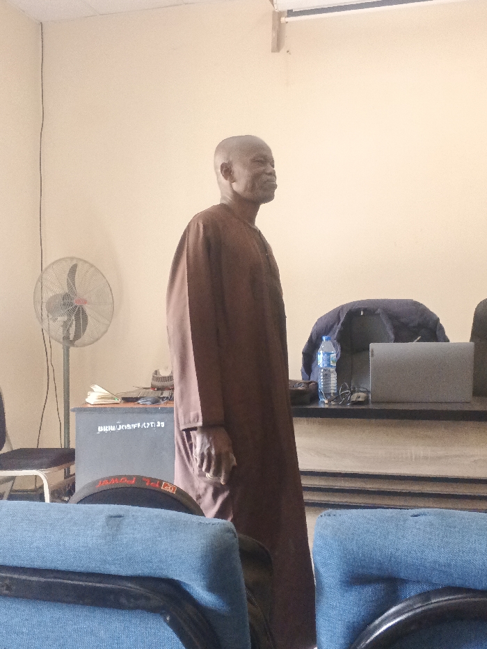 An adult male with a bald head, dressed in a long brown traditional garment, stands facing slightly to his right within an indoor space