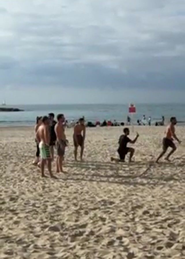 group of people playing a game of volleyball on a beach under a cloudy sky. The group consists of around seven young men, most of whom are shirtless and wearing shorts. They are positioned on the sandy beach, with the sea visible in the background. Some other people are present in the distance, sitting and walking along the shoreline. A red and white sign is visible near one of the players. One of the men wearing a black shirt is actively hitting the volleyball, while the others are either waiting to receive the ball or watching the play unfold. The sandy beach dominates the foreground, and the sea extends to the horizon under the overcast sky.