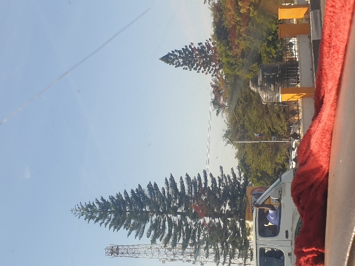 The image depicts an urban street scene in Jos, Nigeria, captured from inside a vehicle. In the immediate foreground, a blurred, textured red fabric extends horizontally across the bottom of the frame. The midground features a white passenger van, visible on a paved surface. A male individual, wearing a white shirt, is observed in the driver's seat with his left arm extended out of the open driver's side window, making a gesture. To the left and behind the van, a tall, slender conifer tree stands prominent. Further left, a metal lattice telecommunications mast is partially visible. To the right, behind a low concrete barrier and a black metal fence, a black cylindrical plastic water tank, branded "ULTIM," is situated. Interspersed along the roadside and near the tank are several short, rectangular yellow concrete bollards or posts. A dense line of diverse green trees and foliage forms the background directly behind the street furniture, with another smaller conifer tree and a flagpole, bearing an indistinct flag, visible within this greenery. The upper background consists of a clear, light blue sky. A faint diagonal line, consistent with a scratch or reflection on a windshield, is present across the upper right quadrant of the sky.