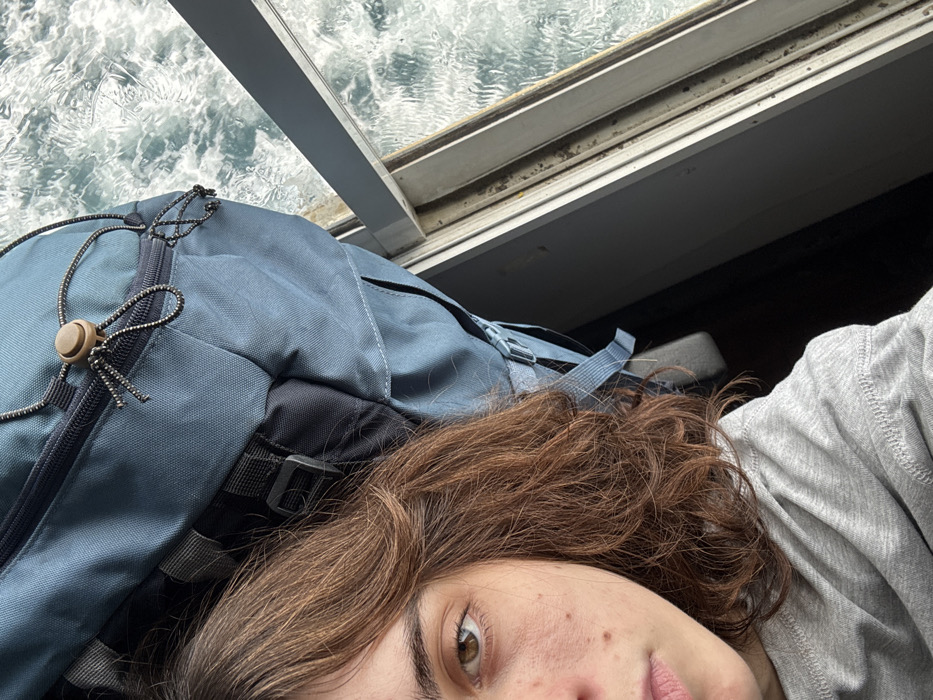 This image captures a partial view of a female individual and a large backpack, situated within a moving vessel, visible through a window overlooking an active body of water