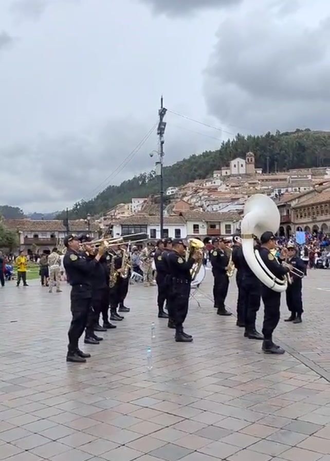 A medium shot shows a marching band in the Plaza de Armas in Cusco, Peru. The band members, wearing black uniforms, are playing various instruments, including trumpets, trombones, saxophones, and tubas. They are standing in formation on the plaza's paved surface. In the background is a hillside filled with buildings and a church with a white bell tower. The sky is overcast. People can be seen walking around the plaza in the background, some of whom are wearing traditional clothing. There are light posts and power lines in the shot. A few plastic water bottles can be seen on the ground near the band. The camera remains still throughout the video.