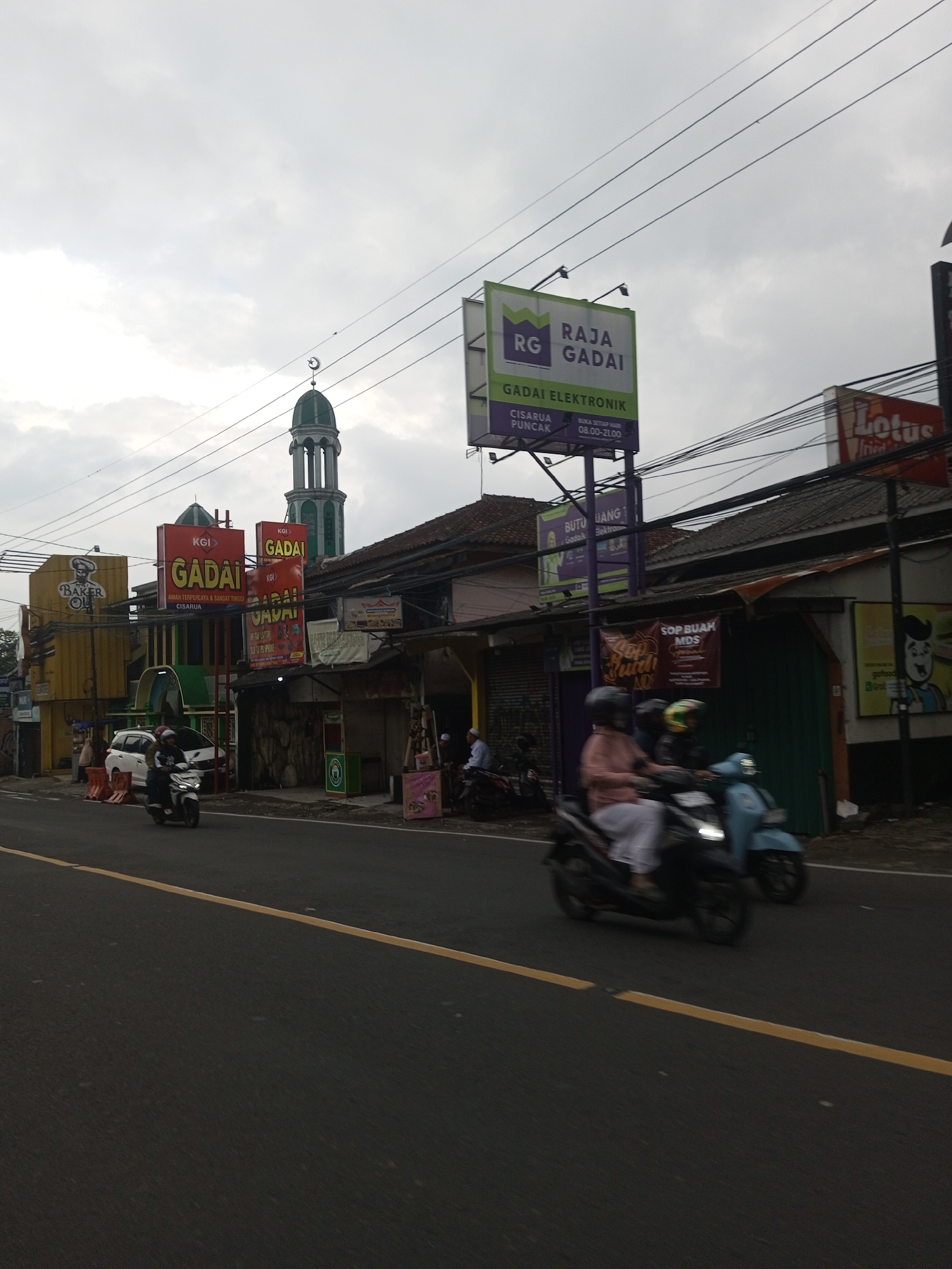 street scene in Ciherang, Indonesia on an overcast day. Motor scooters are moving along a paved road with a yellow dividing line. Buildings line the side of the road, identifiable by colorful signage indicating businesses such as pawn shops (Gadai), bakeries, and food vendors. A mosque minaret is visible in the background. Power lines crisscross the sky. People are present on the scooters and standing or seated near the buildings.