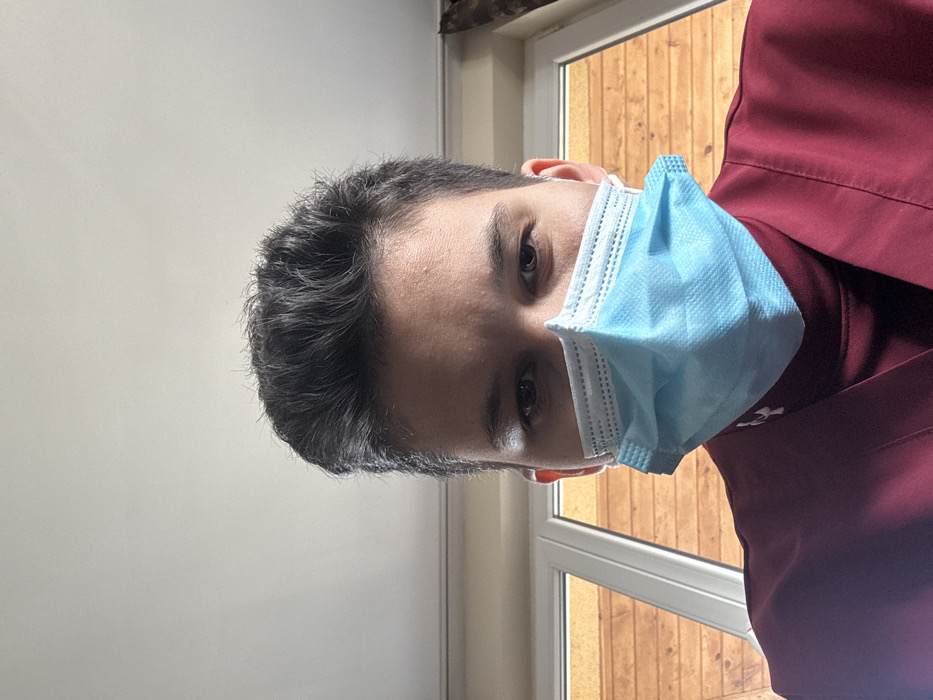 A frontal close-up shot captures an individual indoors in the city of Mirovyane, Bulgaria. The subject is a young adult with short, dark, textured hair, dark eyebrows, and brown eyes, looking directly at the camera. A light blue, pleated surgical mask covers the nose and mouth. The individual is wearing a dark red (maroon) garment, possibly medical scrubs, over a dark turtleneck or undershirt which features a white "Under Armour" logo on the left chest area. The background features a plain, light-colored ceiling overhead. Behind the subject, a window with a light-colored frame reveals a wooden exterior wall with horizontal paneling. A dark brown patterned curtain is partially visible on the right side, adjacent to the window.