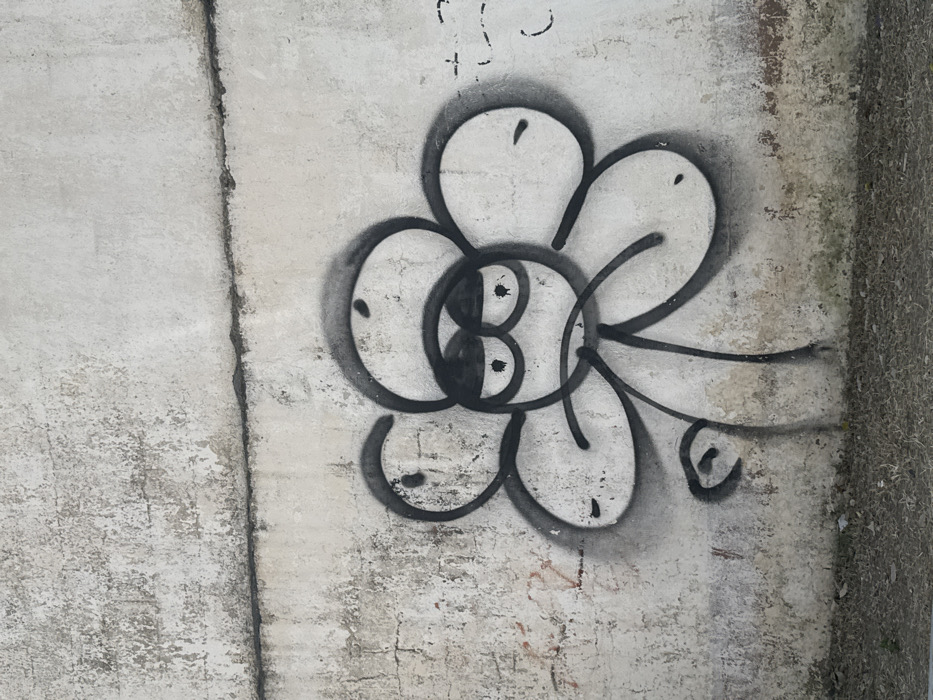 A spray-painted, stylized flower adorns a textured concrete surface