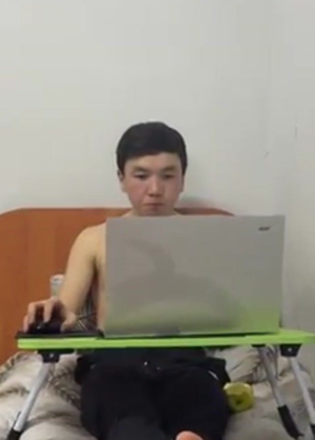 A young man is seated cross-legged on a bed, shirtless and wearing dark pants. He's using a laptop placed on a green folding lap desk. His feet are bare and resting towards the camera. He is looking at the laptop screen and using a mouse. An apple sits to the side of the laptop. The bed has a patterned gray and beige cover. The background consists of a white wall and a brown headboard. A window is visible in the top left corner of the frame.