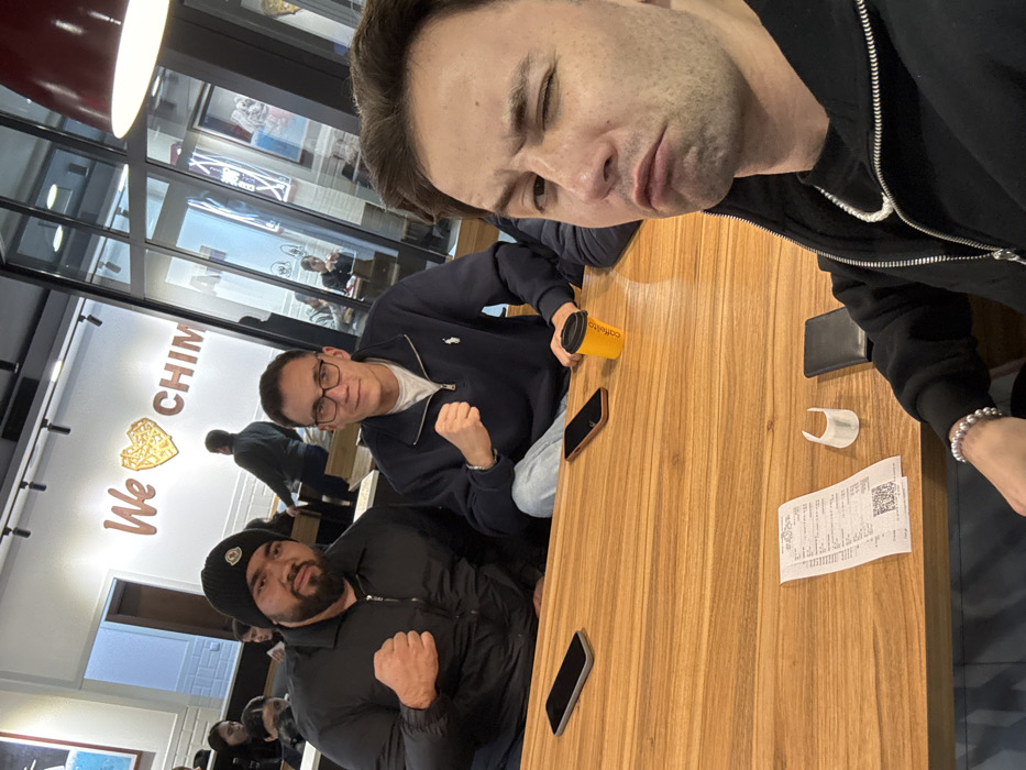 Three men are sitting around a wooden table in a restaurant. One man is taking a selfie, wearing a black jacket and a silver beaded bracelet. Another man wears a navy sweater and glasses. The third man has a black beanie. Each man is making a fist with his hand. A yellow coffee cup, three phones, a black wallet, a plastic cup, and a restaurant receipt are on the table. A sign saying "We love Chimi" is on the wall.