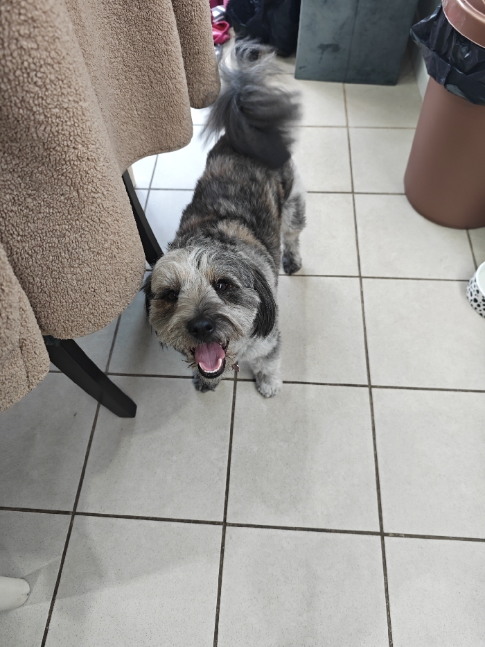 - "The image displays a small, shaggy-furred dog, predominantly grey with black and white markings, standing on a light-tiled floor in an indoor domestic environment within the city of Chelmsford, United Kingdom" by FM-XRse82, licensed under CC BY 4.0