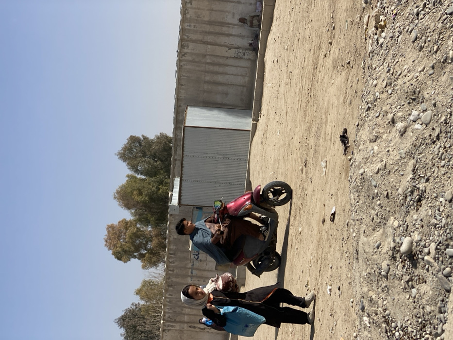 A man rides a red scooter on a dirt road with a woman walking alongside him. The woman carries a blue bag and a brown purse. In the background is a tall concrete wall, a corrugated metal structure, and several trees. The ground is rocky and dusty. The sky is clear and blue.