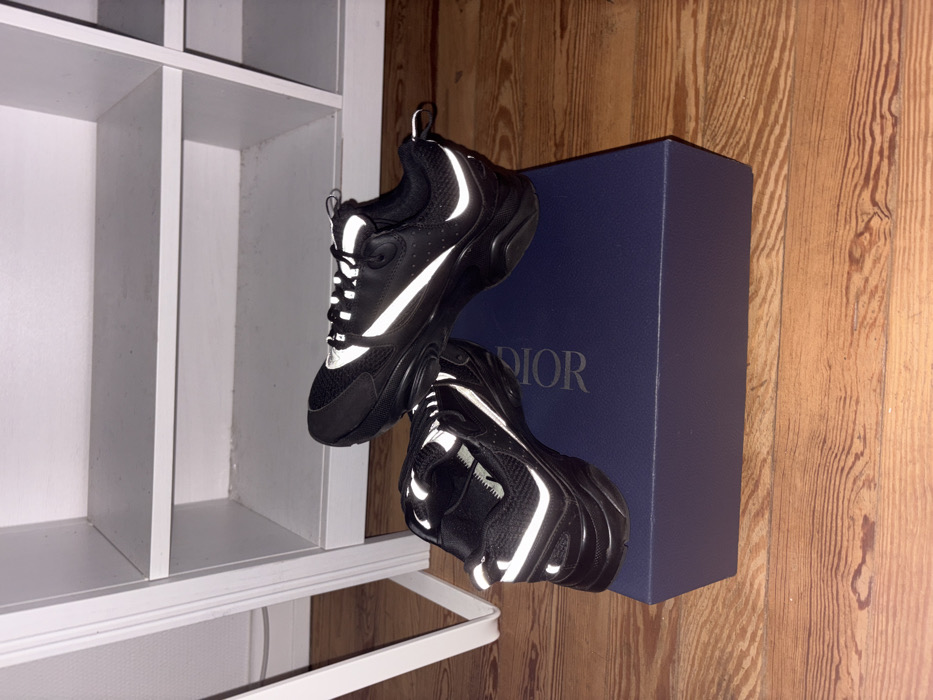 - "The image depicts two black athletic shoes, identifiable as Dior B22 sneakers by their design featuring prominent white reflective stripe accents on the sides, toe box, and heel" by FM-ErVNw2, licensed under CC BY 4.0