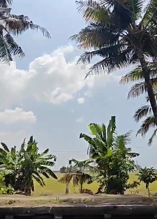 tropical landscape. The foreground is a dark-colored waterway, possibly a canal or river. The focus is on the far bank of the waterway, where there are many palm trees and banana trees. Behind the trees is a field of short, yellow crops, likely rice. The sky is blue with scattered white clouds. The video is taken from a low angle, making the trees appear tall and dominant in the frame.