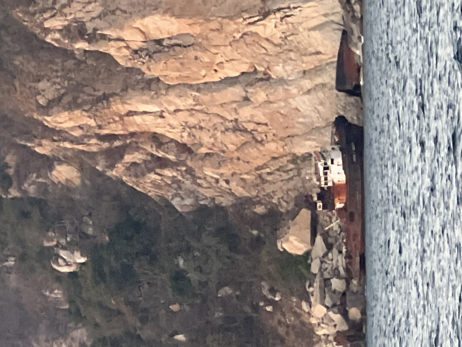 A rugged, rocky cliff face dominates the scene, transitioning into sparse vegetation. The cliff's texture reveals layered stone formations. At the base of the cliff, amidst rubble and a patch of greenery, sits a small, boxy structure. A corroded, wooden beam runs along the cliff edge. To the right, a textured gray wall with linear patterns stands vertically.