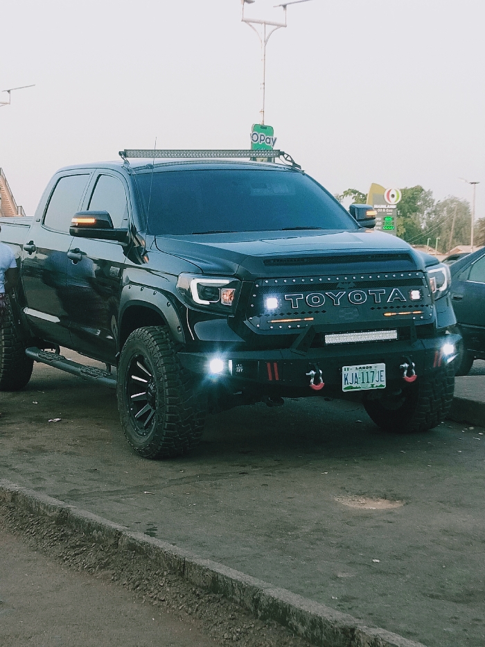 A modified black Toyota Tundra truck sits parked on a paved surface. It features aftermarket additions: an aftermarket grille with "TOYOTA" lettering, fender flares, off-road tires, a front bumper with LED lights and tow hooks, and a roof-mounted light bar. The license plate reads "KJA-117 JE." In the background, a gas station and a utility pole are visible.