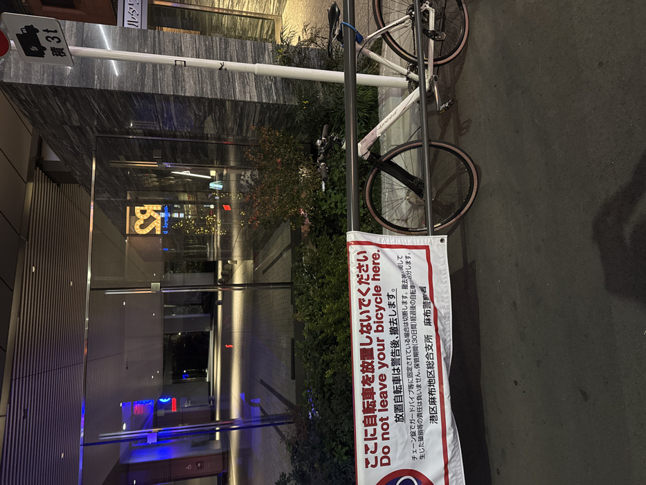 - "An illuminated urban scene at night in Minato Ward, Azabu, Japan, displays a white single-speed or fixed-gear bicycle secured to a metal barrier in front of a modern building with a glass facade" by FM-4DZAk2, licensed under CC BY 4.0